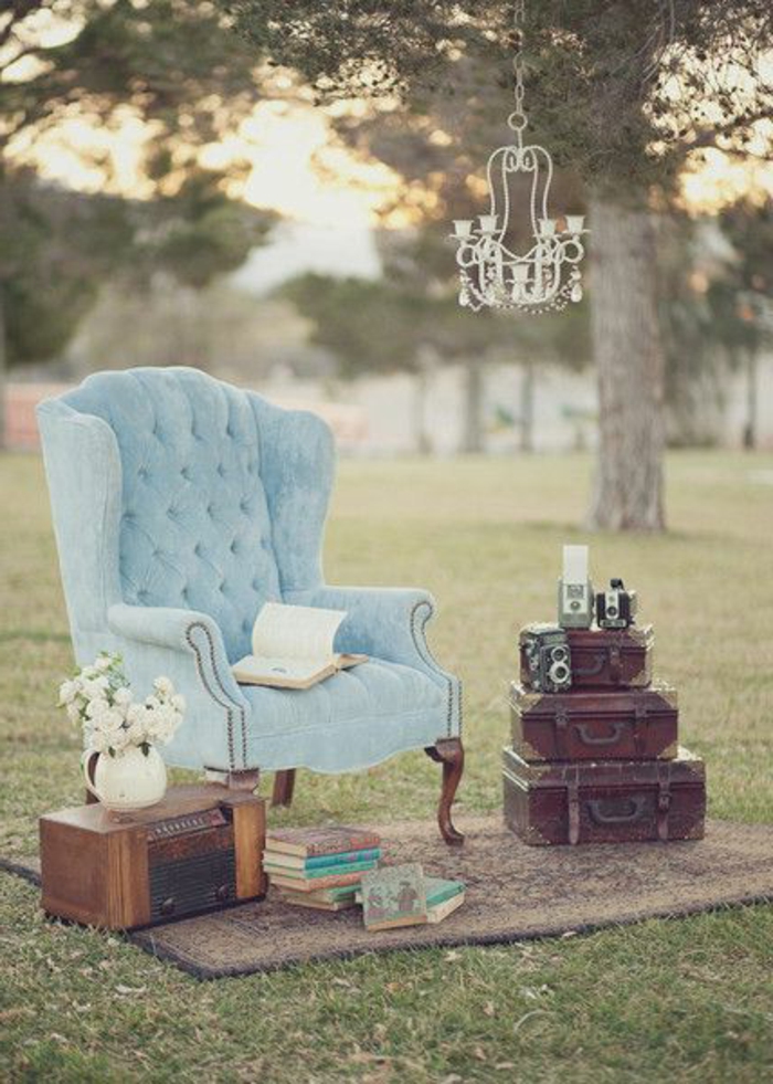 Shabby chic bilder blauer sessel draußen