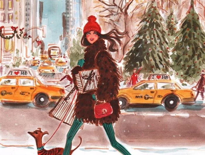 Schöne weihnachtliche Bilder zum Nachmalen, Frau mit grünem Kleid hält Weihnachtsgeschenk, neben Weihnachtsbaum