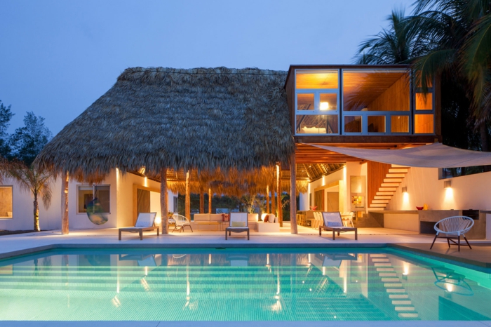 Häuser am strand effektvoller pool und schöne beleuchtung