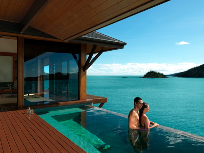 Häuser am strand ein liebespaar im pool beobachtet das meer