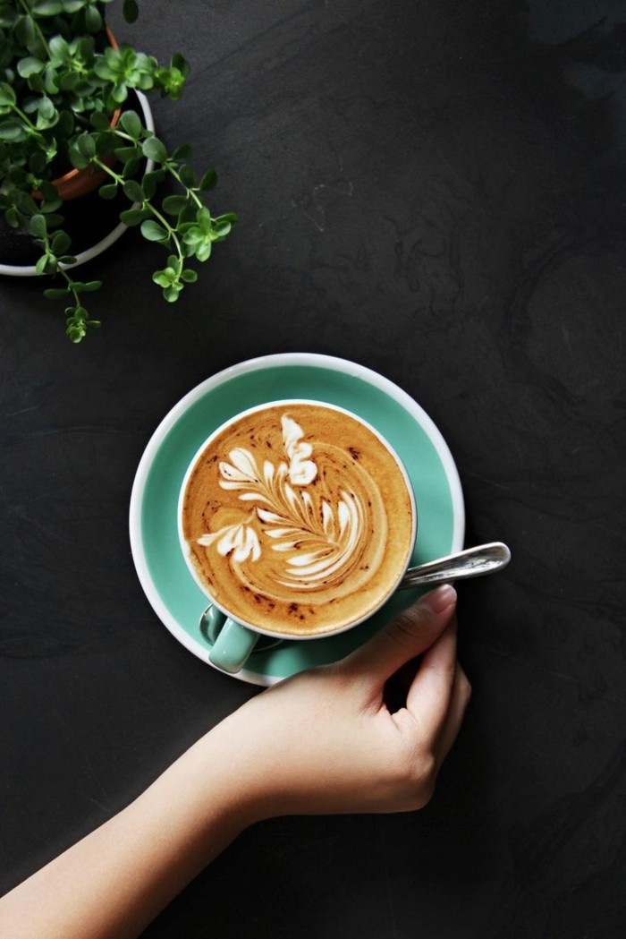 Gruener kaffee schoenes bild fuer instagram kaffee spezialitaet und gruene pflanze deko schwarzer hintergrund