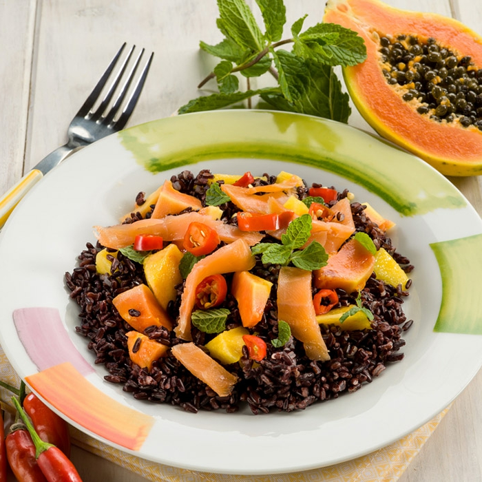 Roter reis gesund schwarzer reis mit gemüse und fisch zubereiten lachs möhren paprika