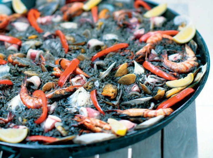 Schwarze reis paella mit schwarzem reis garnelen paprika zitrone gesunde ernähtung
