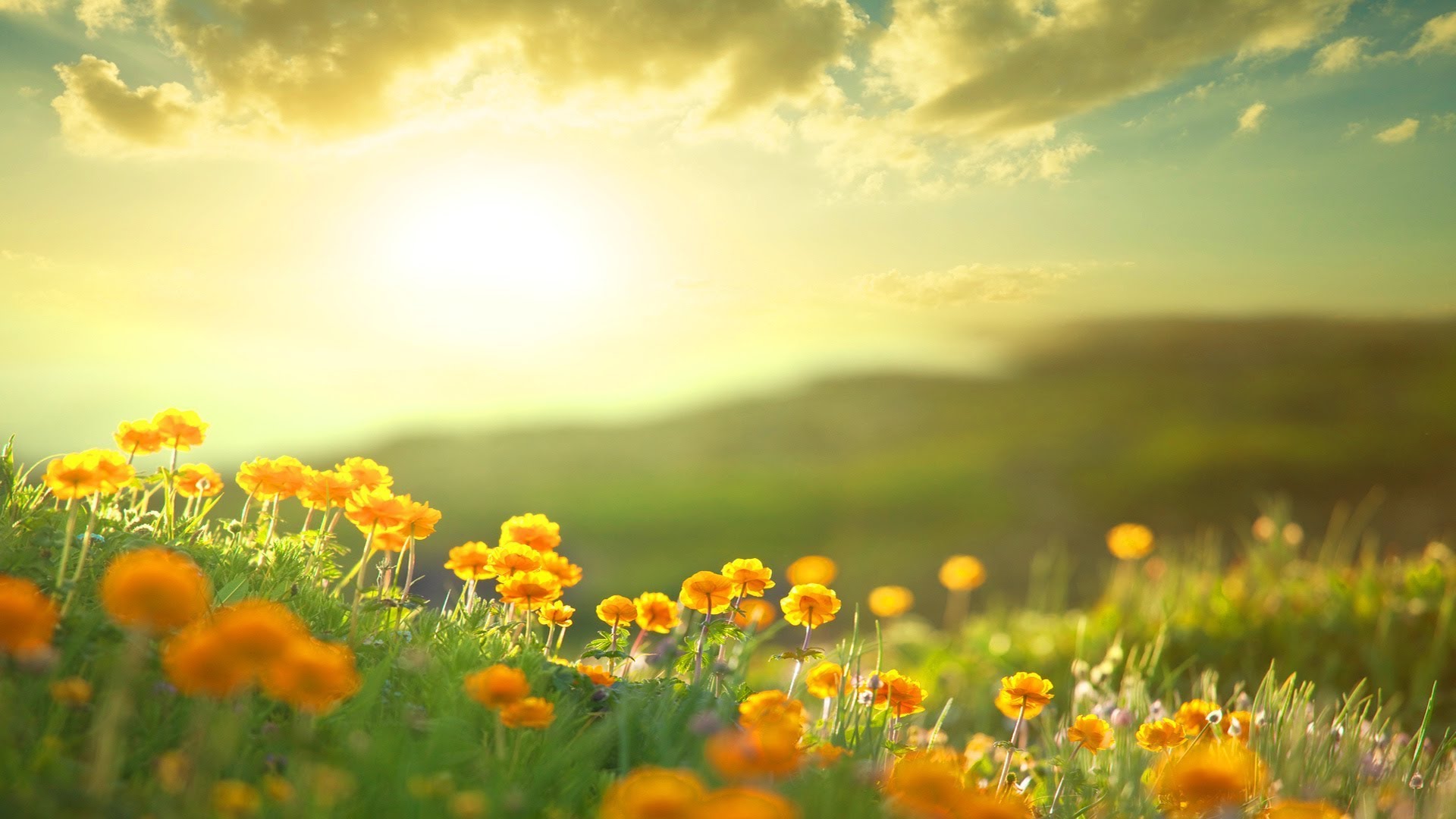 Einen wunderschönen guten morgen die sonne geht auf einer wiese mit schönen orangen blümchen