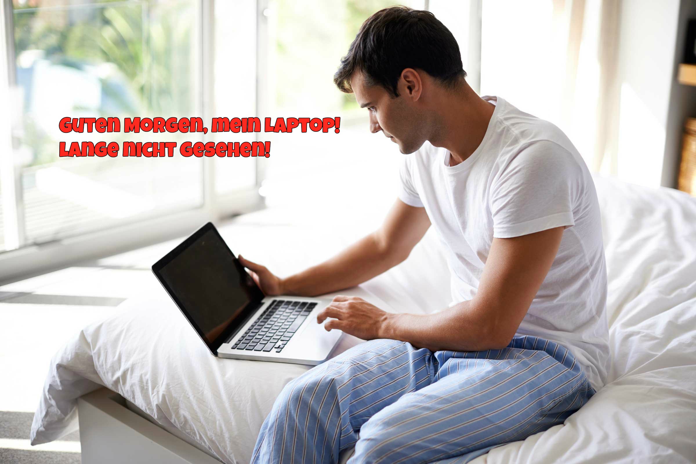 Einen wunderschönen guten morgen ein cooler mann in schlafanzug beginnt der morgen mit dem laptop