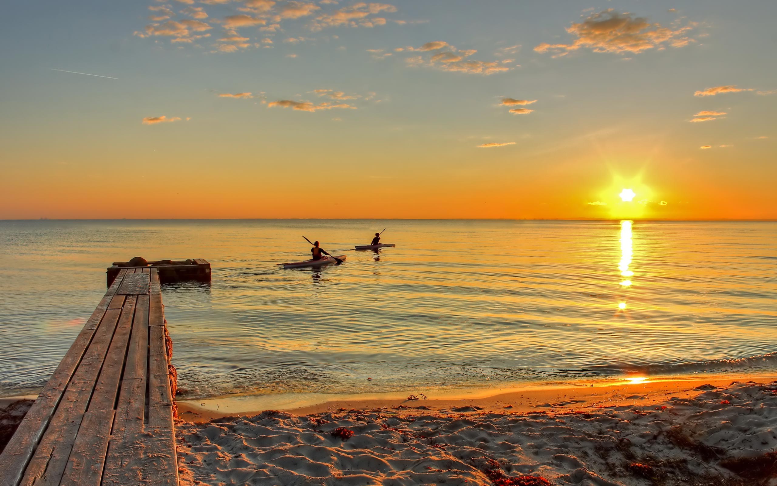 Einen wunderschönen guten morgen sonnenaufgang bilder am meer zwei menschen mit booten segeln zu der sonne