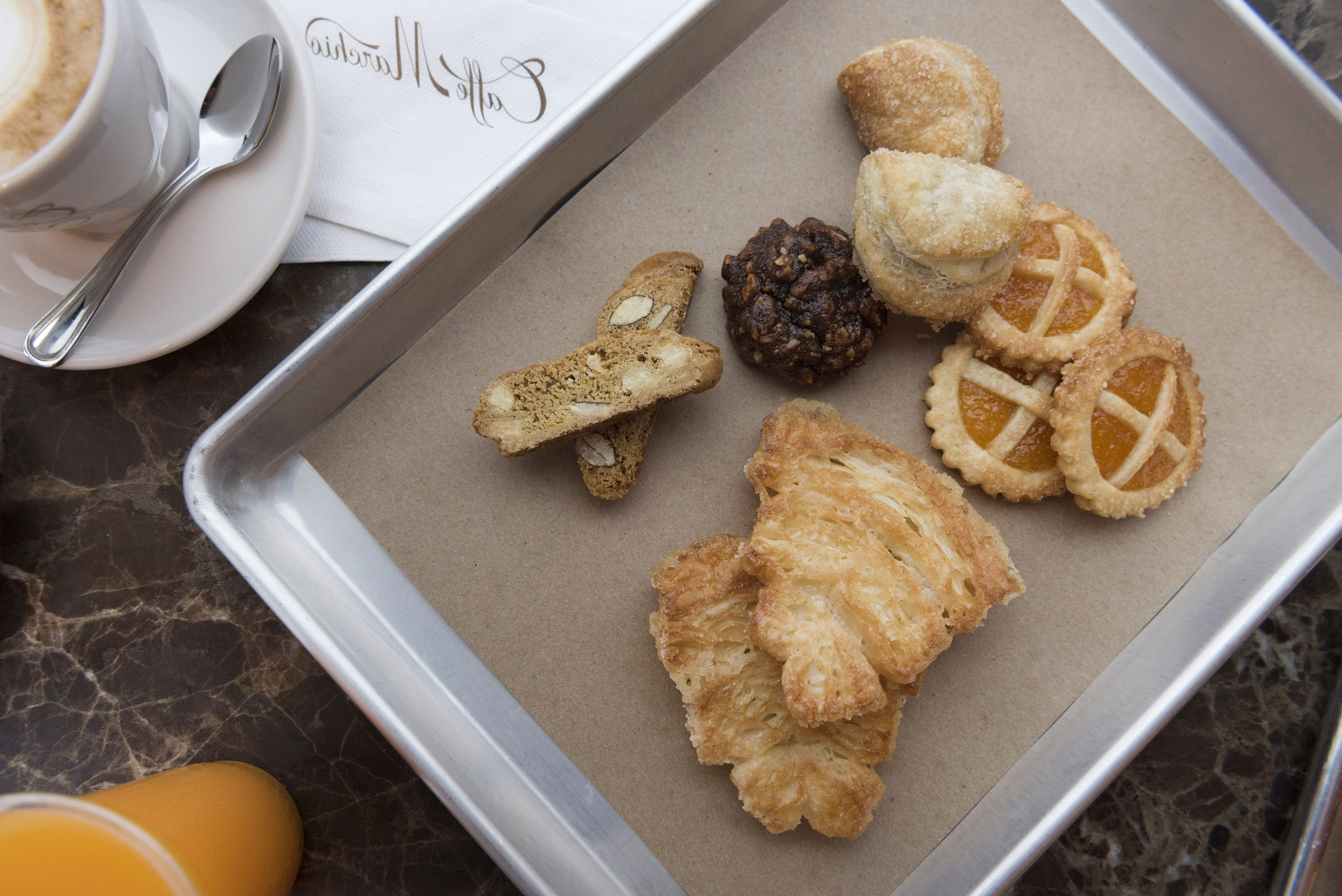 Guten morgen bilder ein blech mit süßigeiten zu frühstück neben kaffee und saft