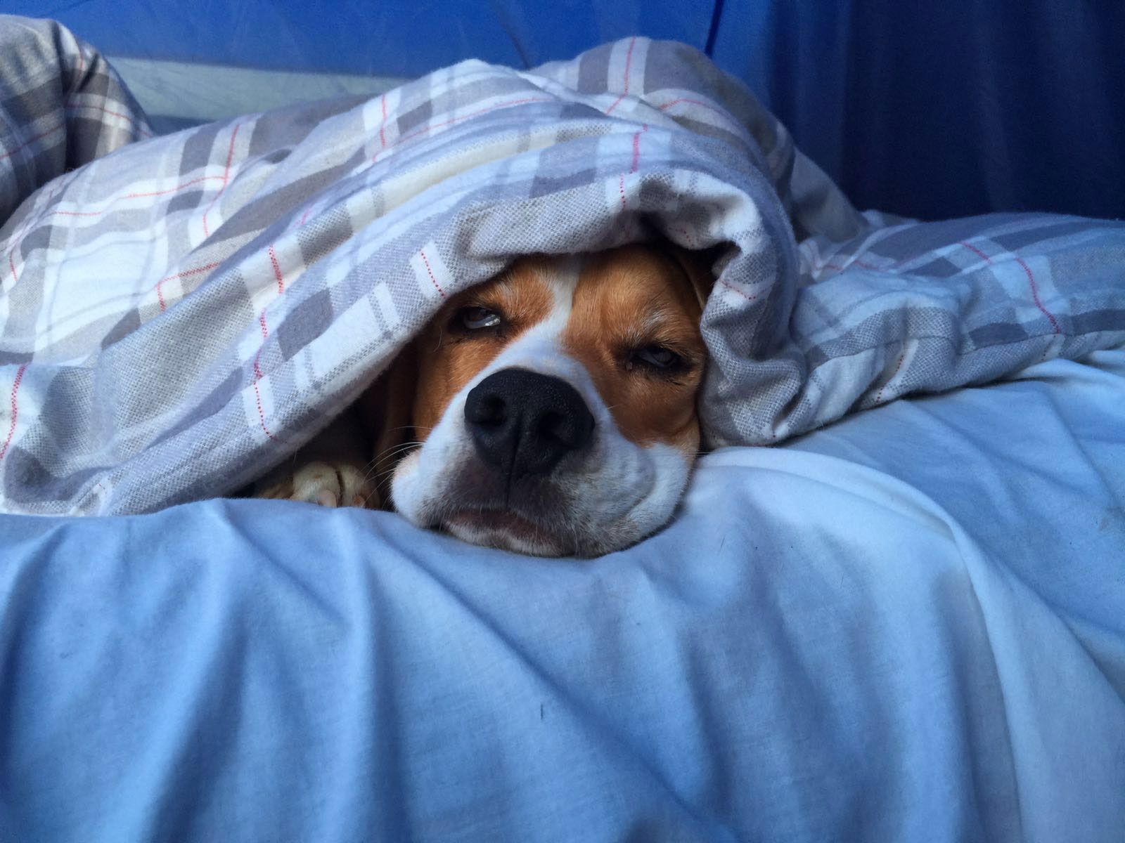 Guten morgen bilder ein schläfriger hund von blauem bettwäsche auf dem bett gehüllt
