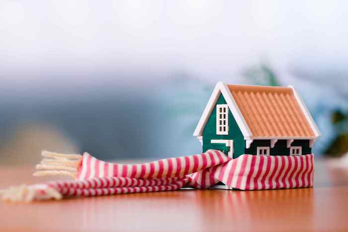 Geld sparen beim heizen kleines grünes haus schal mit roten und weißen streifen heizungssystem spartipps