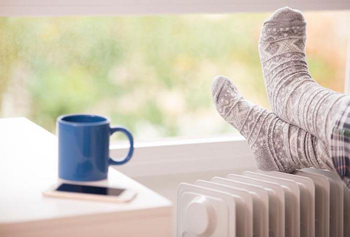 Geld sparen spartipps füße graue socken zentrallheizung blaue kaffeetasse handy