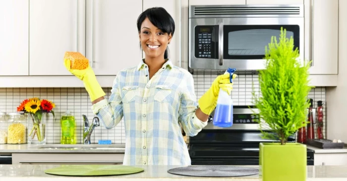Hauspersonal frau reinigen spray küche mikrowelle pflanze waschbecken weiße küchenfronten