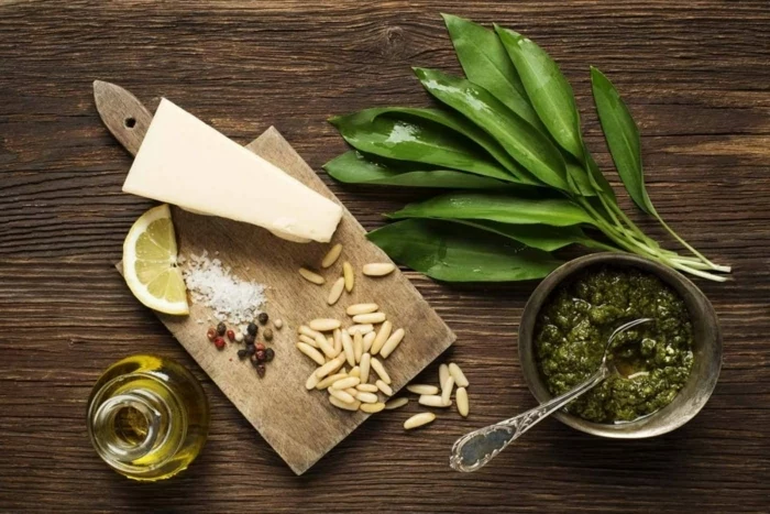 brett aus holz ein grünes bärlauch pesto grüne bärlauch blätter ein löffel