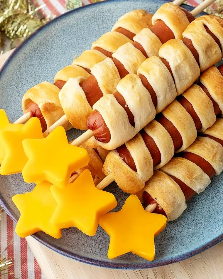 - Zum Schluss stechen Sie Cheddar-Sterne aus, indem Sie eine Ausstechform verwenden und dekorieren Sie jeden Spieß damit.