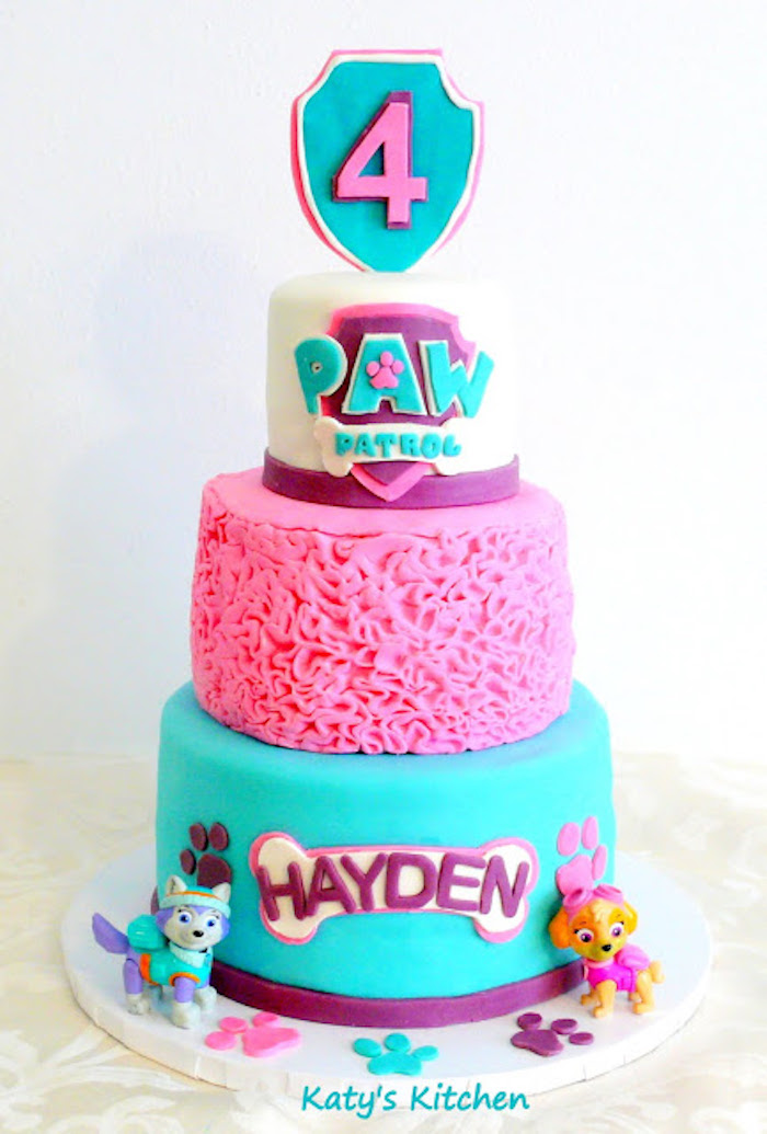 Kindergeburtstagstorte bilder dreistöckige torte paw patrol blau rosa weiß mit pfoten
