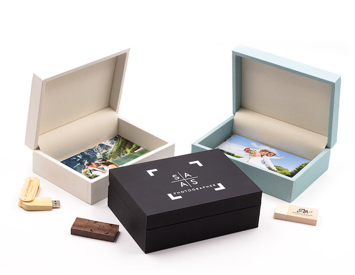 Bedruckte verpackung in schwarz mit weißen buchstaben hochzeitsfotos senden luxuriöse schachteln werbung