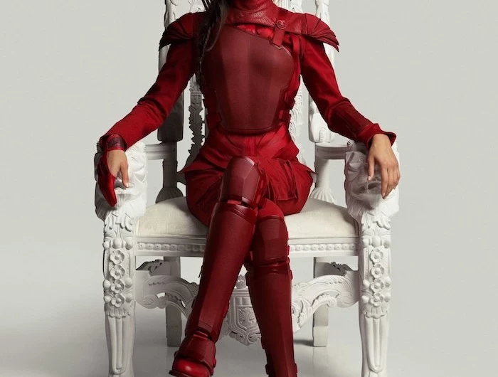 großer weißer stuhl, eine junge frau mit roten stiefeln und einem roten kostüm aus ledder, die schauspielerin jennifer lawrence als katniss everdeen