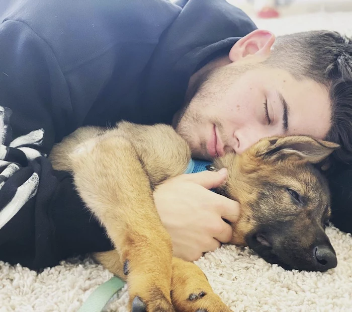 ein kleiner welpe deutscher schäferhund und der amerikanische sänger nick jonas, eine überrascung von priyanka chopra
