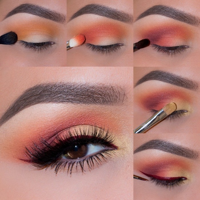 7 schminktipps augen braune augen mke up in orange und geln künstliche wimpern roter lidstrich