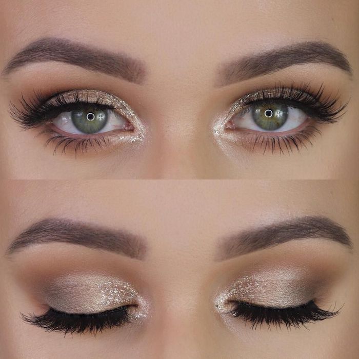 Grüne augen betonen festliches make up in gold glitzer flasche wimpern