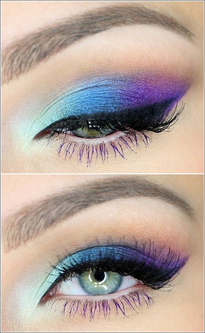 Grüne augen betonen make up in blau und lila bunte lidschatten falsche wimpern