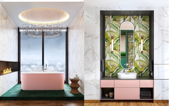 Bad fliesen ideen bilder marmor optik keramik badewanne rosa waschbecken pflanzen muster