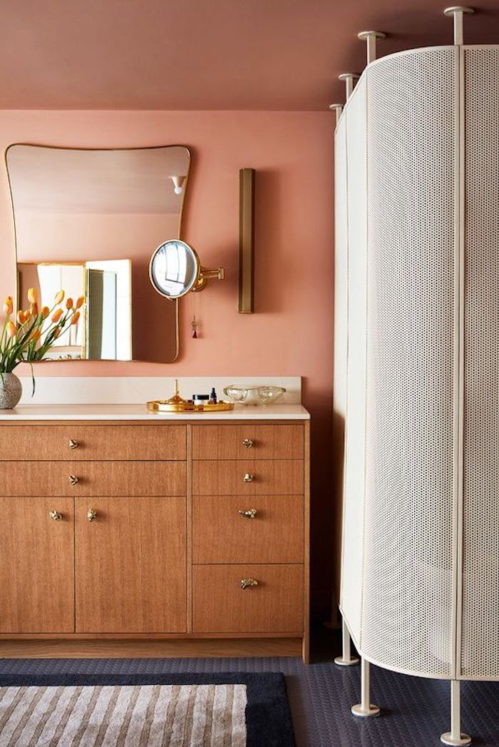 Bad ideen vintage holzschrank abgerundeter spiegel duschkabine
