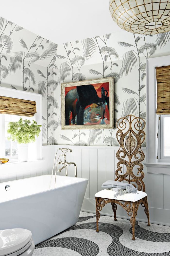 Badezimmer gestaltungsideen wasserfeste tapete keramik badewanne stuhl schnörkeleien