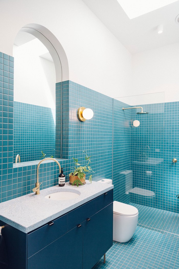 Badezimmer ideen bad gestalten blaue fliesen waschbecken steinoptik grüne pflanze