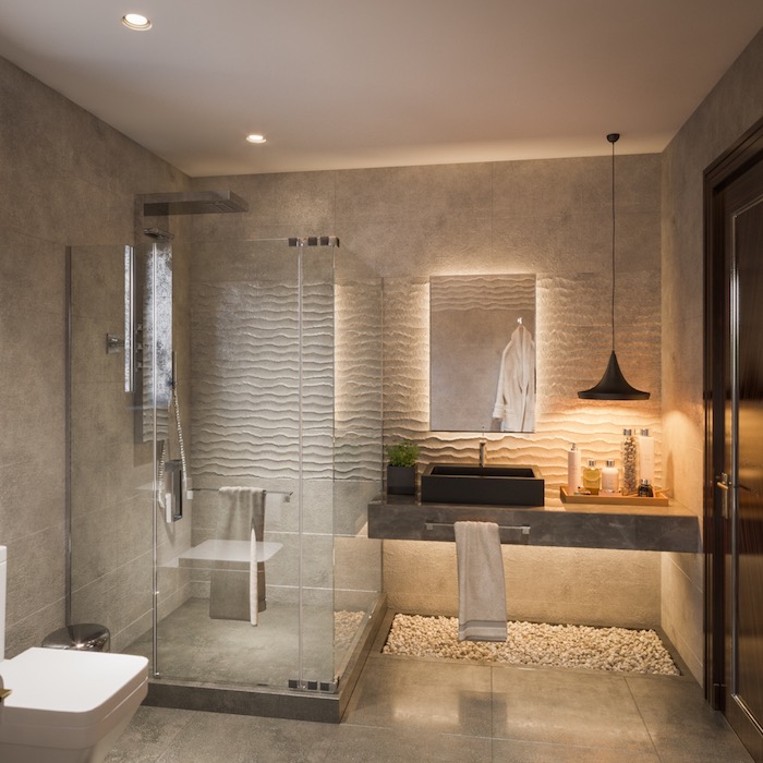 Badezimmer ideen bilder duschkabine glas marmor waschbecken wandfarbe beige