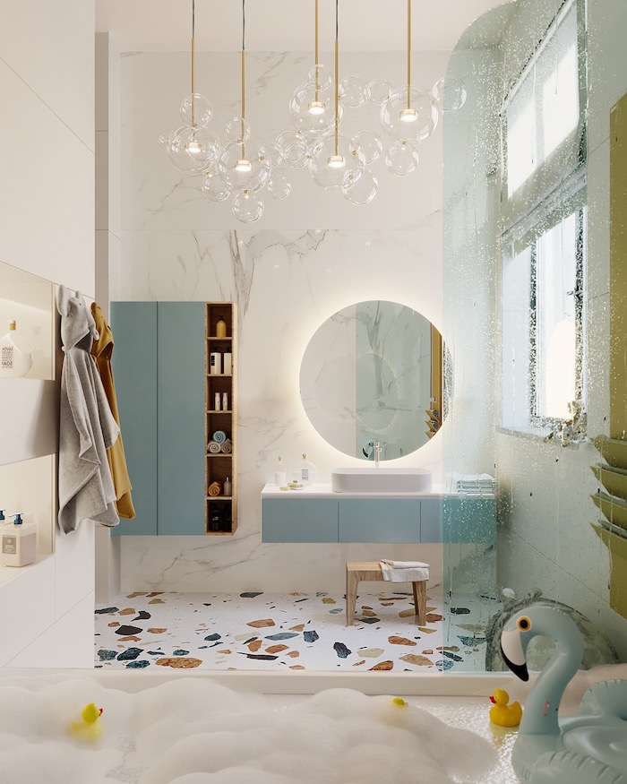 Badezimmer ideen lampen seifenblasen runder spiegel wandgestaltung marmor optik blaue schränke aufblasbare flamingo