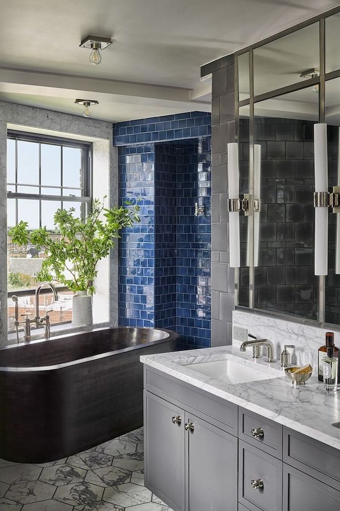 Badezimmer modern bad fliesen ideen bilder dunkelblau badewanne holzoptik waschbecken marmor