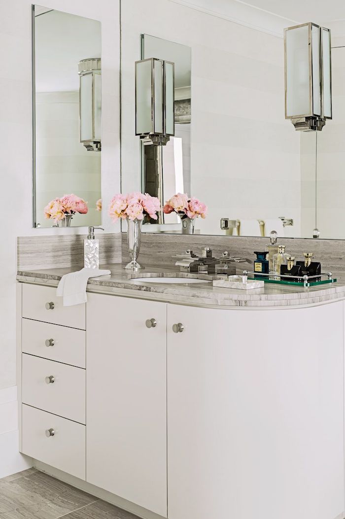 Kleines bad gestalten eckschrank zwei spiegel waschbecken holzoptik