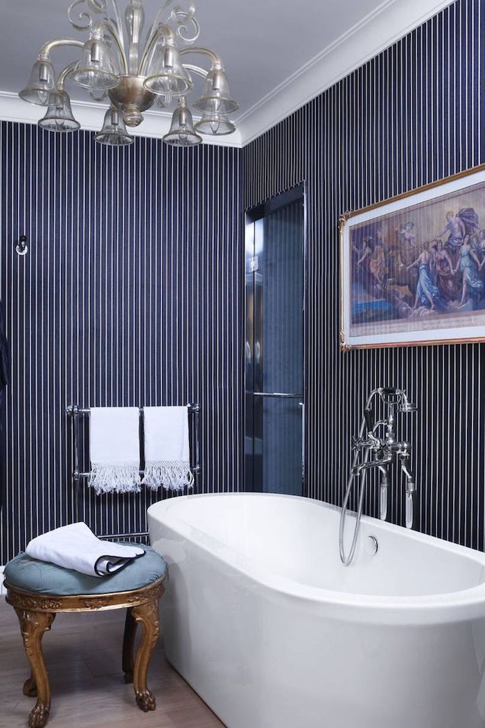 Moderne bäder wandgestaltung dunkelblau weiße streifen keramik badewanne gocker gold optik
