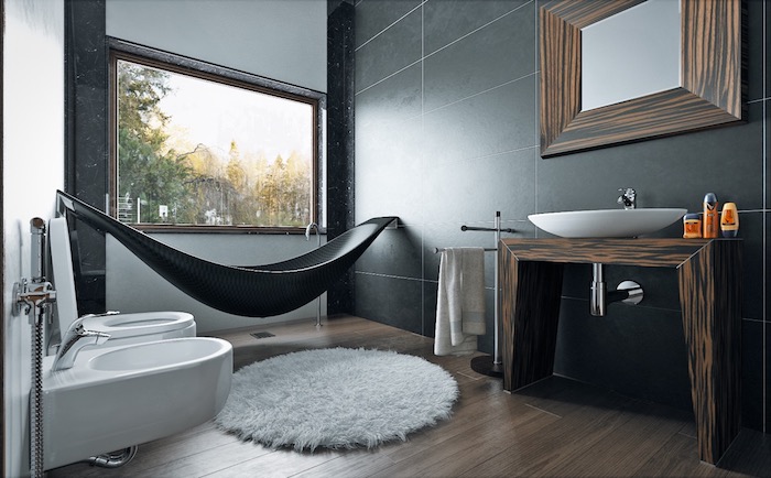 Moderne badezimmer bad fliesen ideen schwarz holzboden spiegel holzrahmen waschbecken keramik