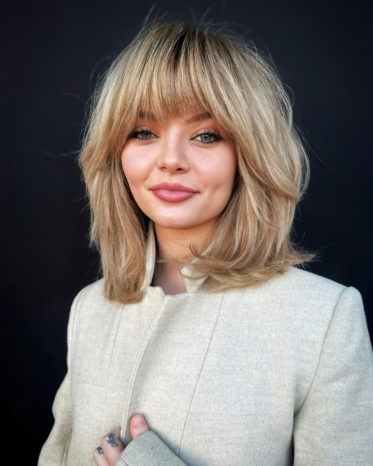 Der „Money Piece“ ist mehr als nur eine Strähne. Es handelt sich um eine gezielte Aufhellung der vorderen Haarpartien, die das Gesicht umrahmen. Bei einem mittellangen Schnitt hat dieser Akzent eine enorme Wirkung: Er öffnet das Gesicht, lässt den Teint strahlen und verleiht der gesamten Frisur eine moderne, sonnengeküsste Dimension – und das mit minimalem Aufwand im Vergleich zu einer kompletten Balayage.