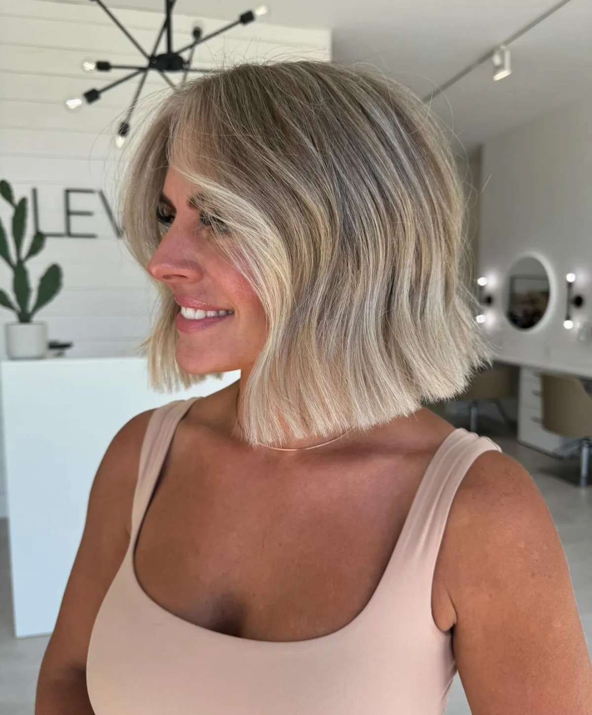 Layered Lob: Mit sichtbaren oder unsichtbaren Stufen versehen. Perfekt für dickes Haar, um Schwere zu nehmen, oder für welliges Haar, um die Textur zu betonen. Der Look ist weicher, bewegter und lässiger.
