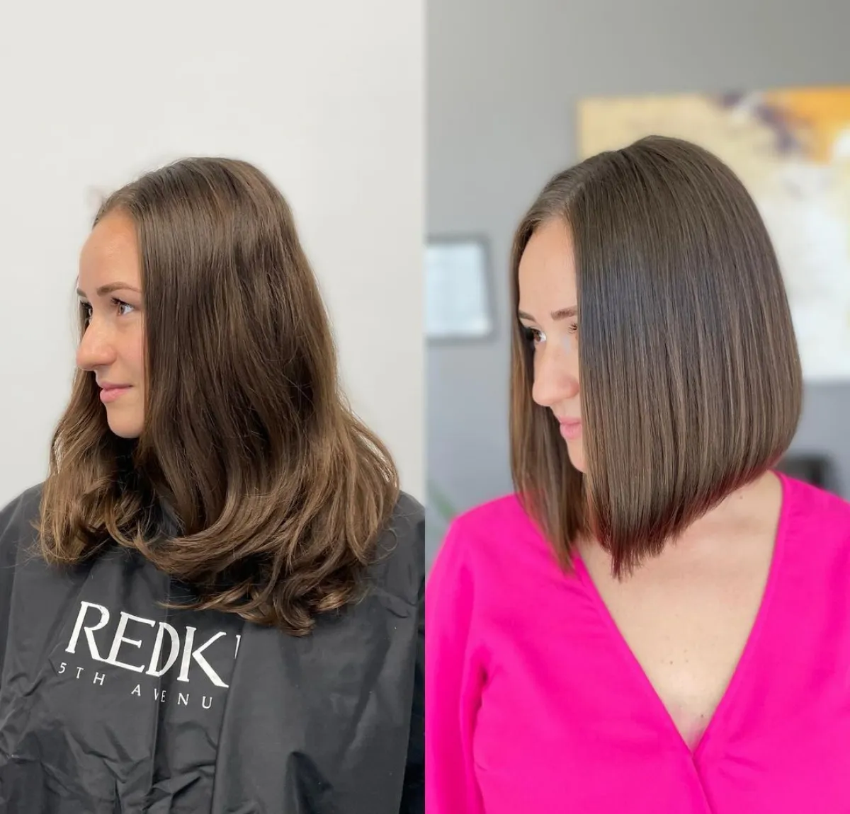 Blunt Cut: Eine einzige, scharfe Längenkante. Ideal für feines Haar, da er die Spitzen maximal voll und kompakt wirken lässt. Der Look ist minimalistisch, modern und grafisch.