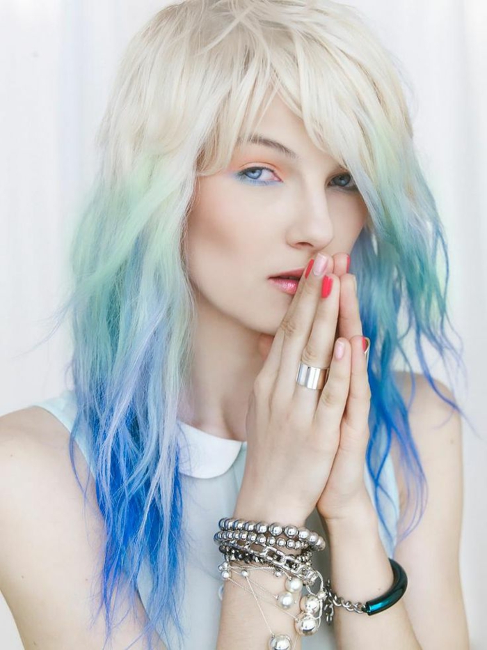Bunte haare blond aqzamarin blau porzellanteint natürlicher make up weißer top viele armbänder oter nagellack