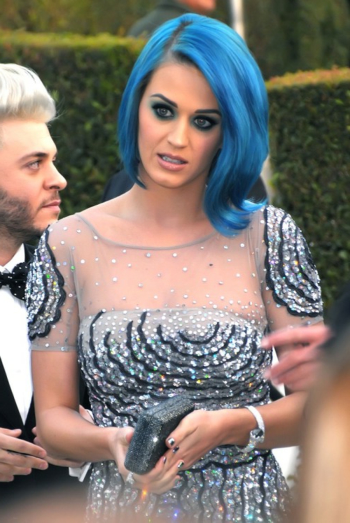 Katy perry mit blauen haaren bob frisur blaue lidschatten abendkleid mit kristallen