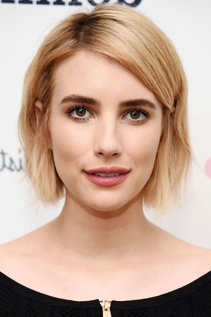 Damen frisuren kurz rauen frisuren bob kinnlang blonde haare braune augen heller hautteint schwarzes top