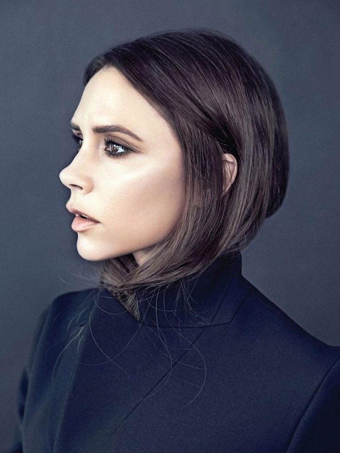Frisuren damen bob kinnlang victoria beckham schwarze haare glatt heller teint matter lippenstift smokey eyes schwarzer blazer