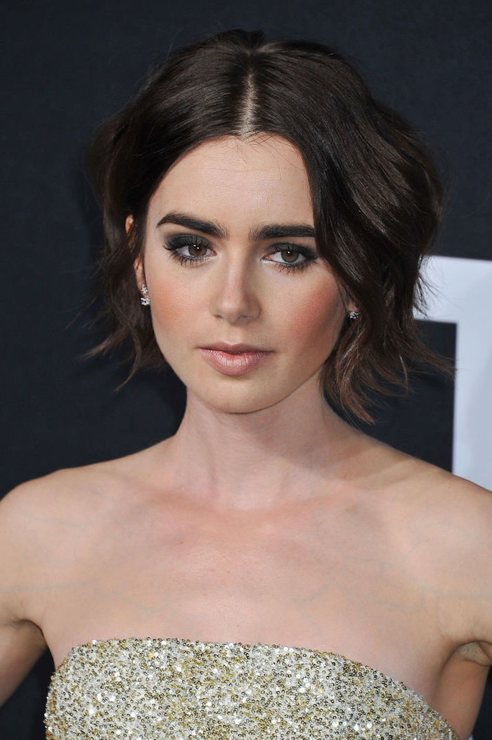 Frisuren damen kurz lily collins bob frisur schwarze haare smokey eyes trägerloses abendkleid mit pailetten