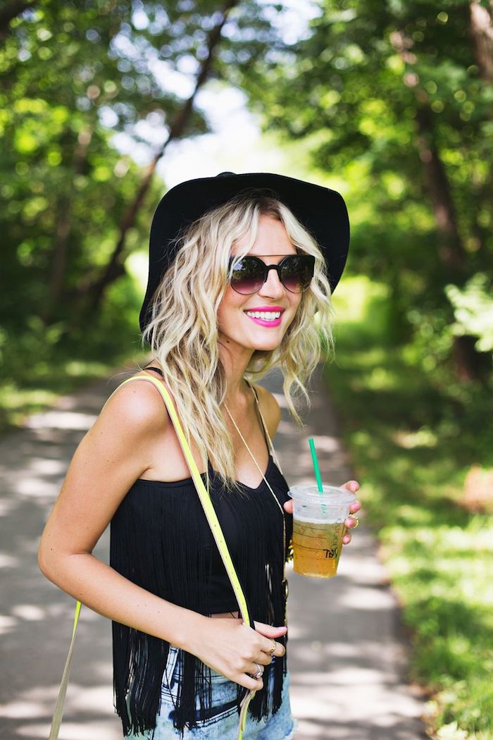 Frisuren ovales gesicht langhaarfrisur blonde haare locken schwarzer hut violetter lippenstift sonnenbrille schwarzes top jeans zitronade
