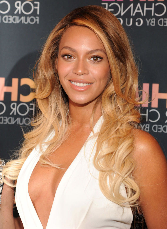 Frisuren ovales gesicht langhaarfrisur locken balayage beyonce weißes abendkleid v ausschnitt achwarze mascara lipgloss