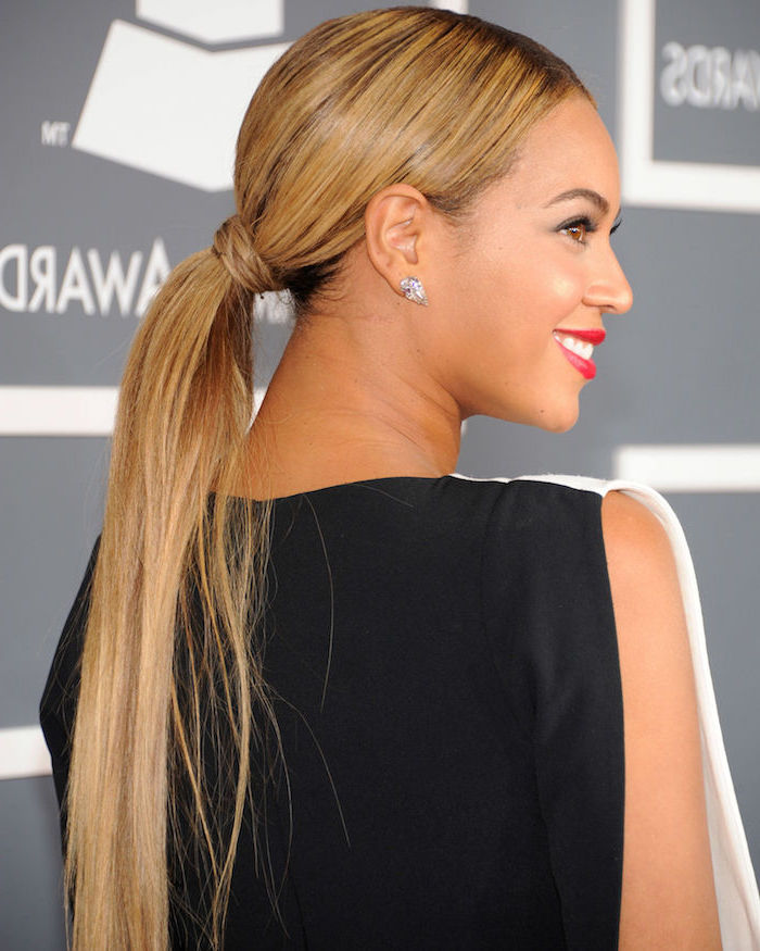 Frisurentrends 2018 beyonce lange glatte haare pferdeschwanz olivfarbene haut silberne ohrringe mit kristallen roter lippenstift