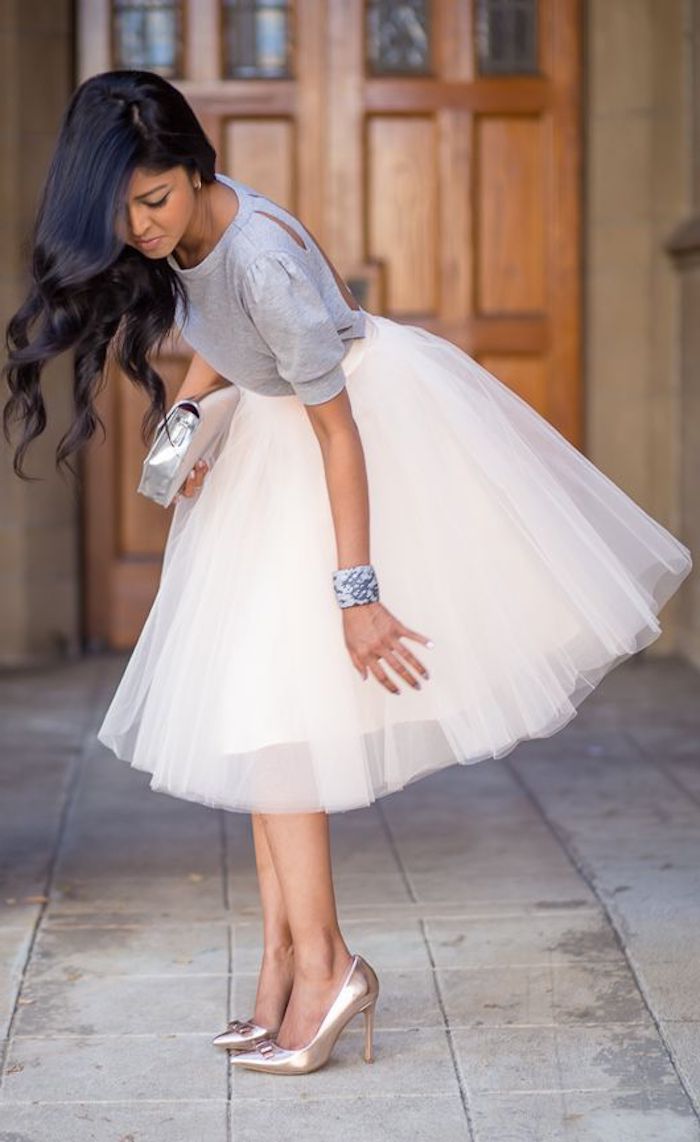 Bohemian style schön tragen tutu in weißer farbe mit absatzschuhen und graue bluse schwarze haare model