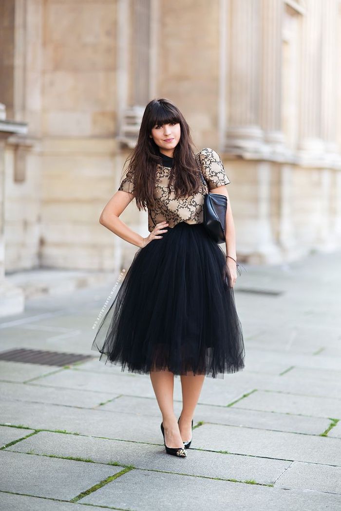 Boho style richtig tragen tutu aus tülle absatzschuhe elegant schwarz lack und spitzebluse haarschnitt mit pony