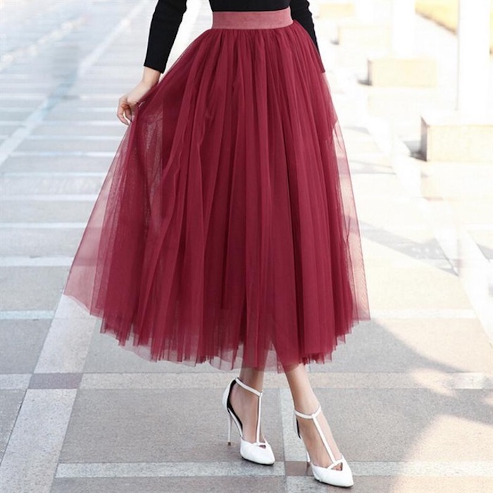 Boho chic kleidung mit tutu rote tutu mit weißen absatzschuhe schöne kombination für den alltag ideen schwarze bluse