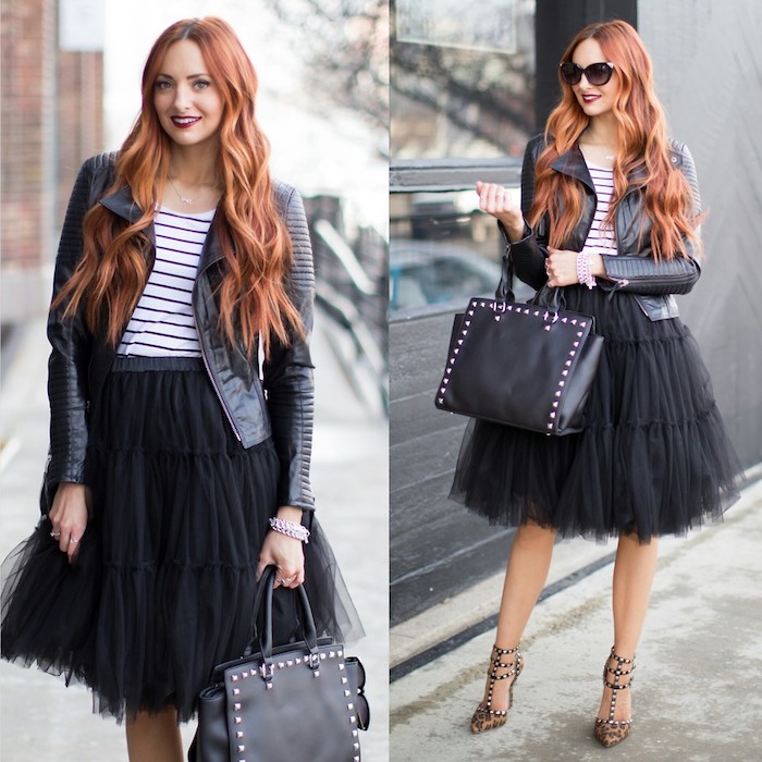 Hippie kleid große größen valentino schuhe absatzschuhe schwarze lederjacke schwarz weiße bluse schwarze tutu lange haare rothaarige model