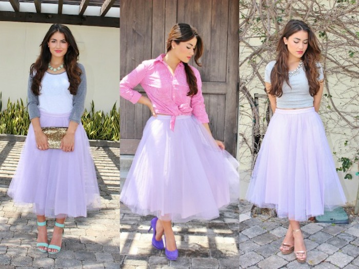 Tüllkleid inspiration lila rock rosa hemd weißer top und graue cardigan schuhkombinationen lila schuhe mintgrüne farbe